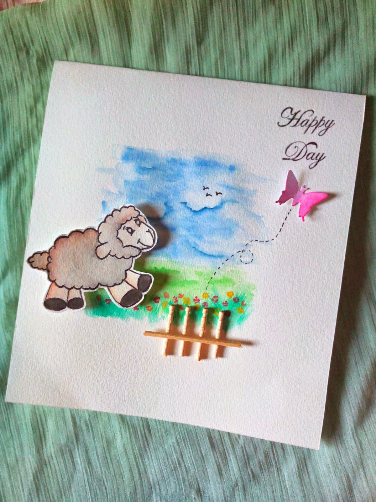 I have used watercolour paper for the base of the card. The scene has been created using wet-on-wet technique. The sheep is hand drawn, watercoloured , fuzzy cut and popped over the base using adhesive foam. Stuck some pieces of wooden toothpicks to make that fence. Added a punched butterfly, hand drew the trial and finally stamped the sentiment.